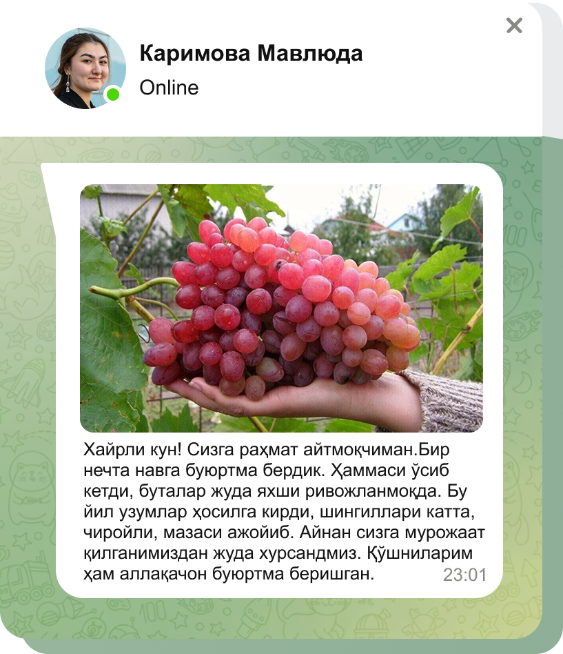 Тўғри экиш ва парваришлаш билан узум сизни мўл ҳосил билан хурсанд қилади.